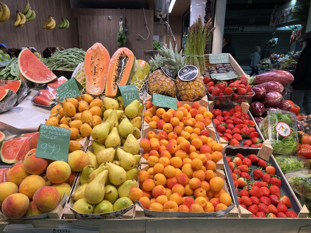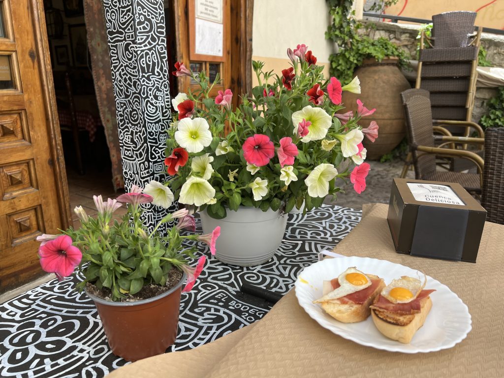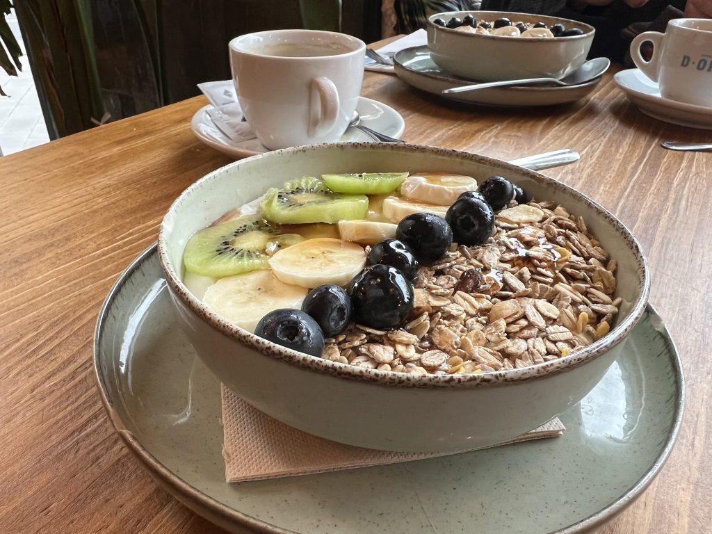 We’ve enjoyed many sunny Spanish days so we were due for a rainy one. It gave us an excuse to rest up a bit – especially since many shops and grocery stores are closed on Sundays. There is a nice cafe on the corner where we’ve been having breakfast. We began our day with a delicious yogurt and fruit bowl.
